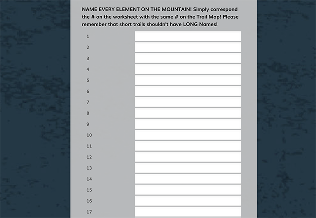 When getting your creativity on and naming everything on YOUR Custom Trail Map, USE THIS FORM TO GO CRAZY WITH NAMING EVERYTHING ON THE MOUNTAIN!